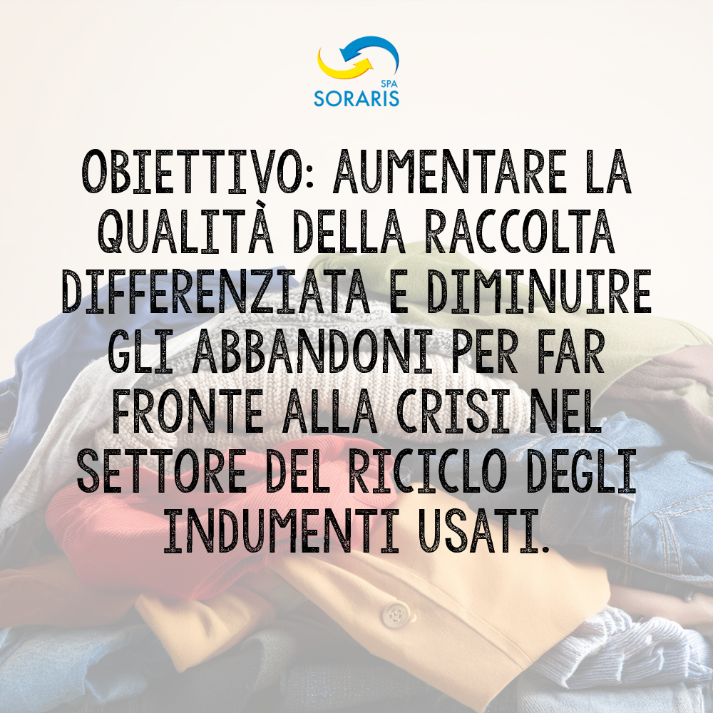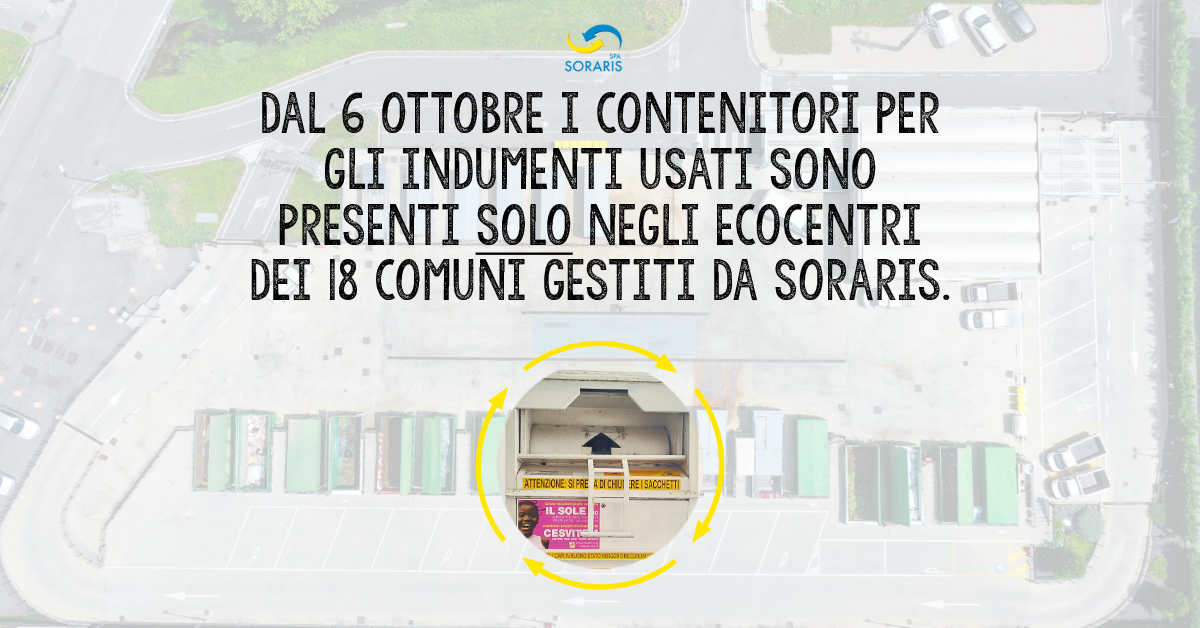 A partire dal 6 ottobre 2025 tutti i contenitori specifici per la raccolta dell’abbigliamento usato da avviare al riciclo sono stati rimossi dal territorio comunale dei 18 comuni soci Soraris. Questi contenitori restano a disposizione degli utenti all’interno degli ecocentri. Quindi d’ora in poi gli utenti potranno conferire gli indumenti usati solo nei contenitori presenti nei centri di raccolta.